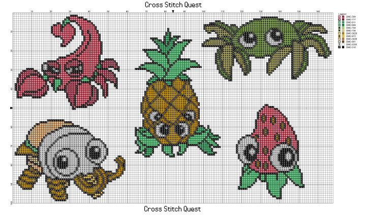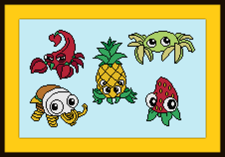 Cross stitch pattern of Bunger, Crapple, Pinantula, Scorpepper, and Strabby from Bugsnax. Download the PDF here: Bugsnax Pattern